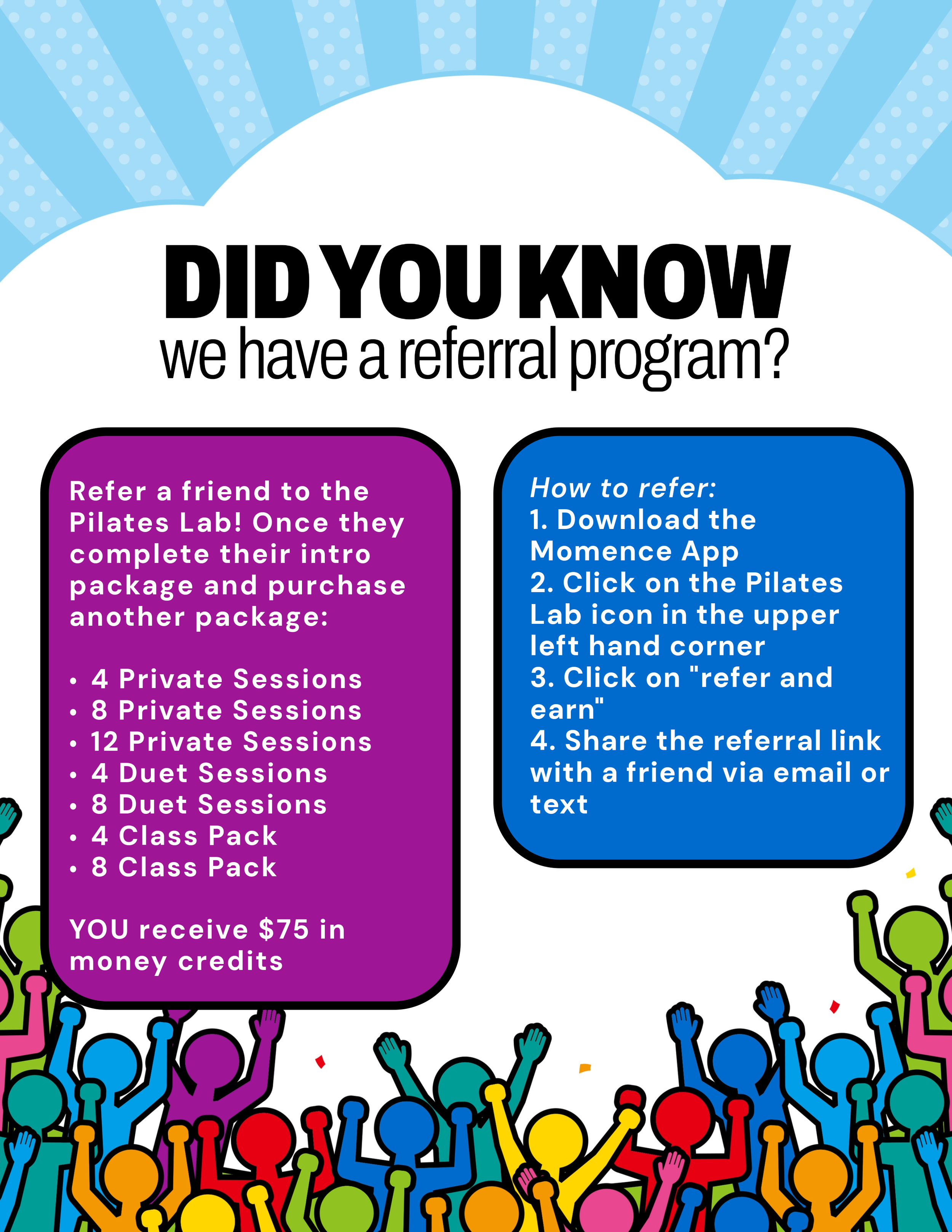 A front desk display flyer introducing Pilates Lab's new referral program to existing clients. Designed to be clear and scannable communicating the program's value quickly to someone passing through the lobby.