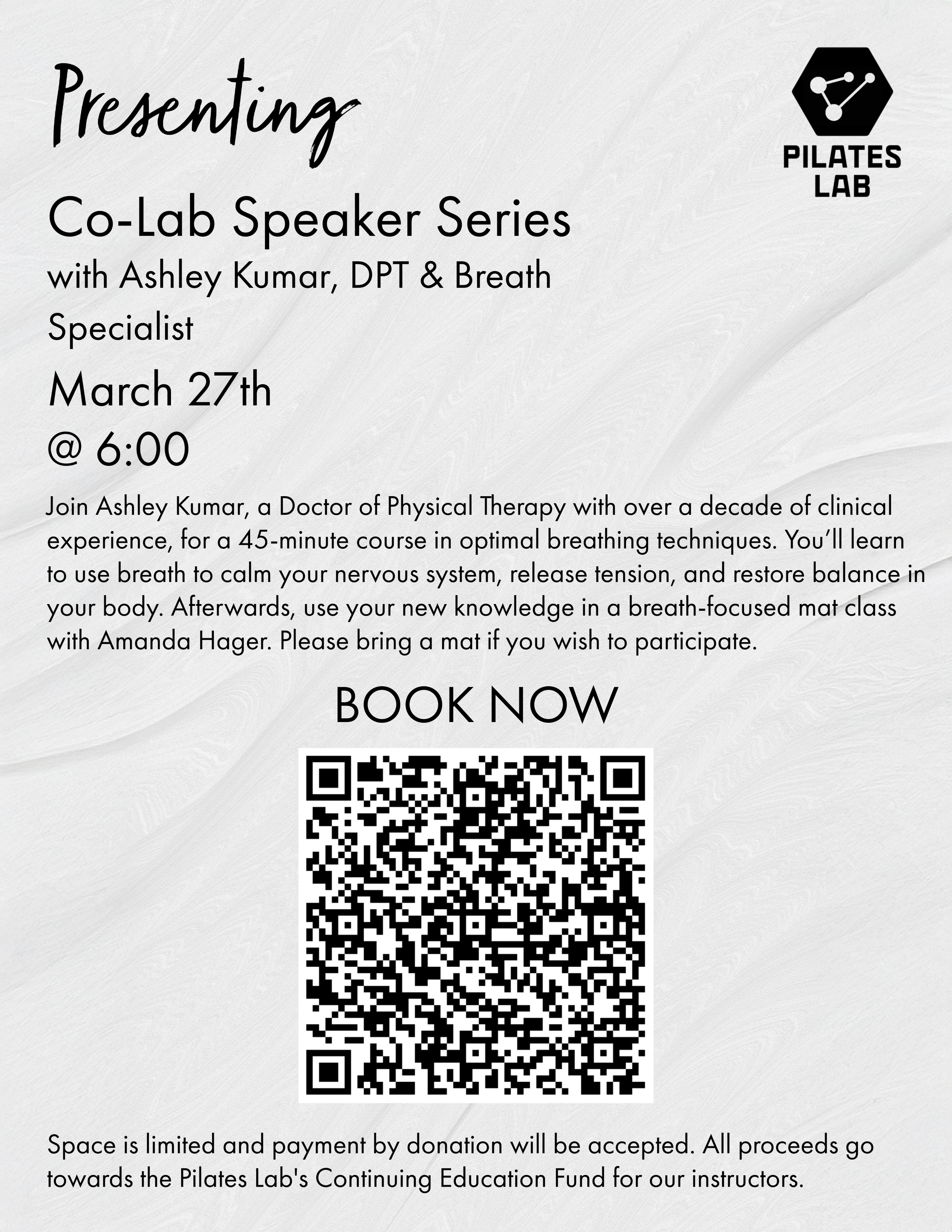 A recurring multi-format campaign promoting Pilates Lab's Co-Lab speaker series, bringing in outside wellness specialists including nutritionists, chiropractors, and breathing experts. Over several months I designed a full suite of graphics for each event spanning promotional flyers, Instagram stories, social posts, and email headers maintaining visual consistency across every touchpoint while giving each month its own distinct creative direction to reflect the featured specialist and their subject matter.