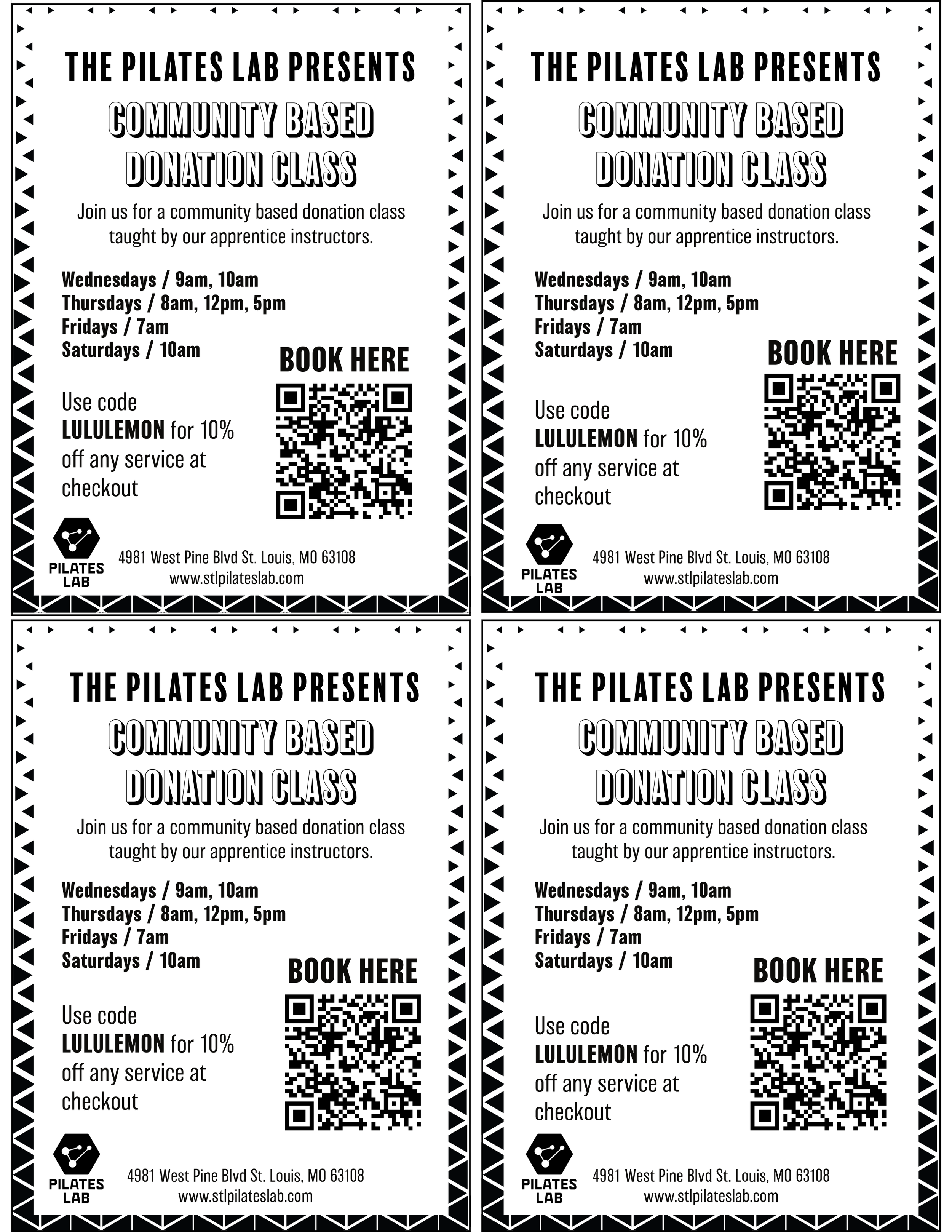 To support apprentices completing Pilates Lab's teacher training program, the studio offered donation-based community classes promoted through local fitness apparel retailers. I designed small-format flyers intended to be handed directly to store employees meaning they had to stop someone cold and make an impression instantly.